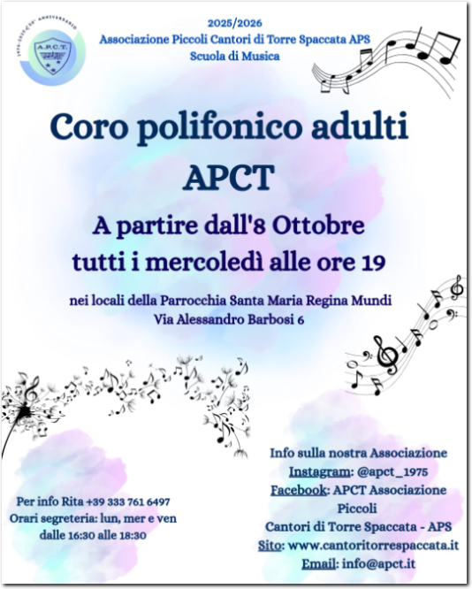 Dal mese di ottobre 2025 prende in carico la direzione del Coro Polifonico Adulti APCT